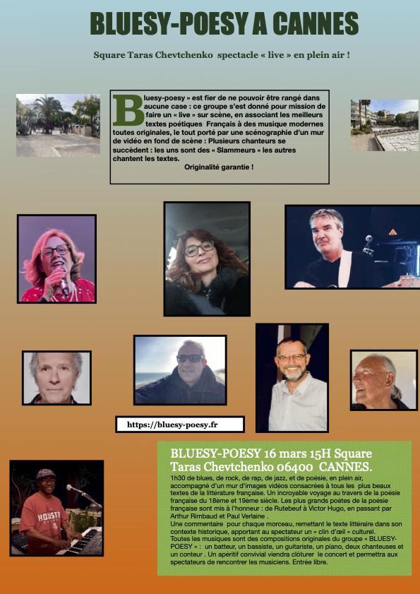 Le groupe « Bluesy-poesy » à investi la place Taras Chevtchenko pour une après midi de poésie en musique offert à tous les Cannois en ce mois d’avril. Tous les grands poètes classiques sont invités à la fête : Victor Hugo, Charles Baudelaire, Jean de la Fontaine, Arthur Rimbaud…