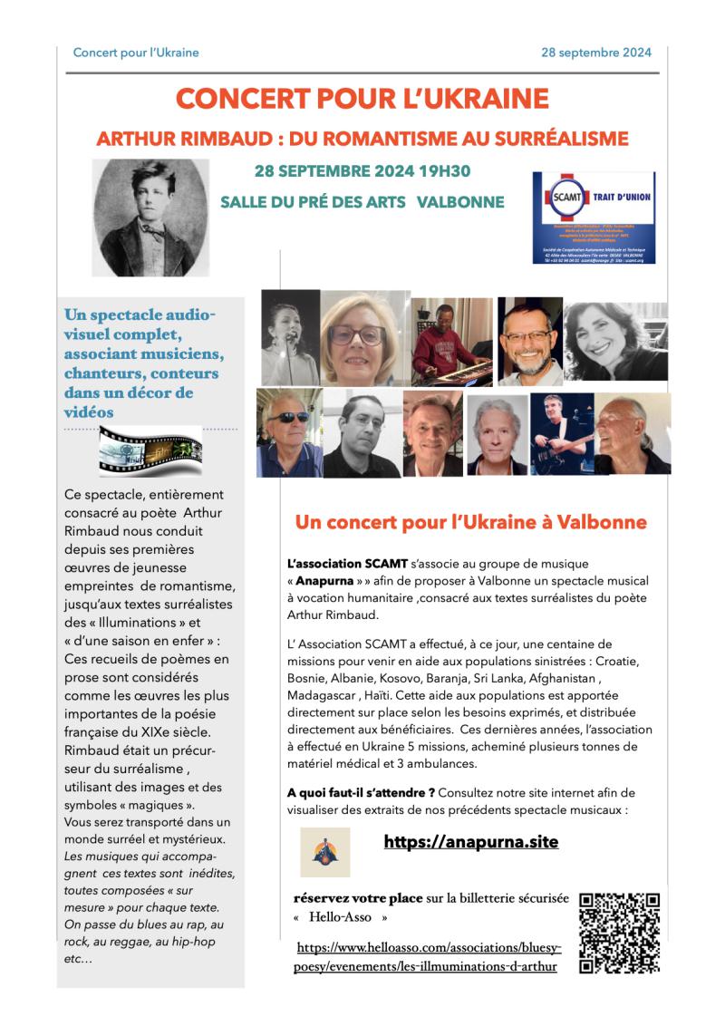 Ce spectacle, consacré au poète Arthur Rimbaud nous conduit depuis ses premières œuvres romantiques de jeunesse, jusqu’aux textes surréalistes des « Illuminations » et « d’une saison en enfer » Rimbaud était un poète surréaliste avant l'heure, utilisant des images et des symboles pour exprimer ses idées de manière non conventionnelle. Les musiques qui accompagnent ces textes sont toutes des pièces originales, composées « sur mesure » pour chaque texte. Les styles musicaux sont très divers mais ont tous en commun une même énergie : blues, rock, pop, rap, slam. L’ Association SCAMT a effectué, à ce jour, une centaine de missions pour venir en aide aux populations sinistrées : Croatie, Bosnie, Albanie Kosovo, Baranja, Sri Lanka, Afghanistan , Madagascar , Haïti. Cette aide aux populations est apportée directement sur place selon les besoins exprimés, et distribuée directement aux bénéficiaires.
